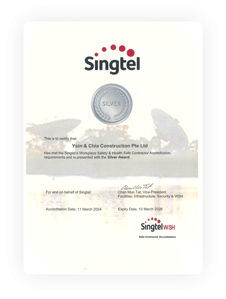 YSIN & CHIA CONSTRUCTION PTE LTD is honoured to be recognised as a Singtel Silver Award Recipient.